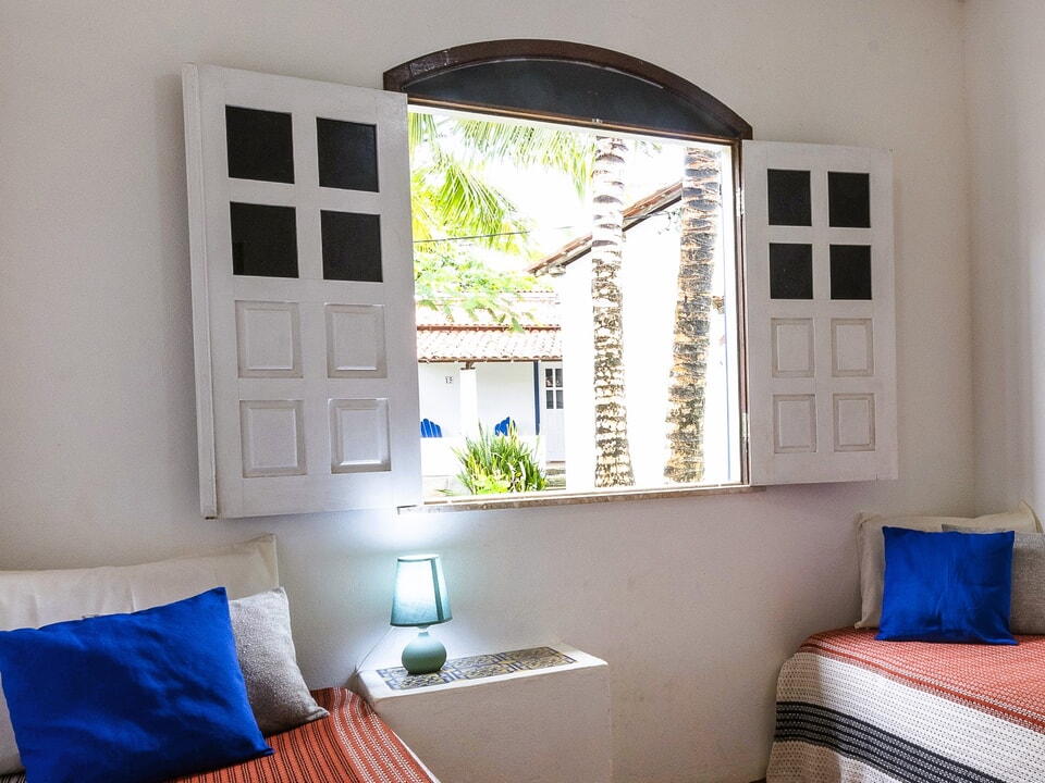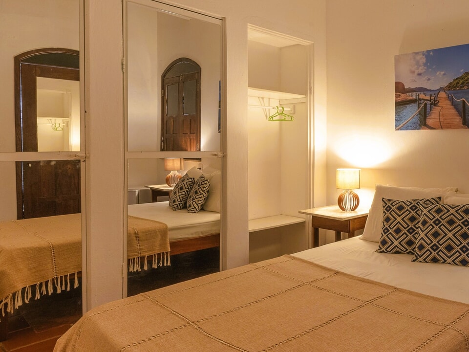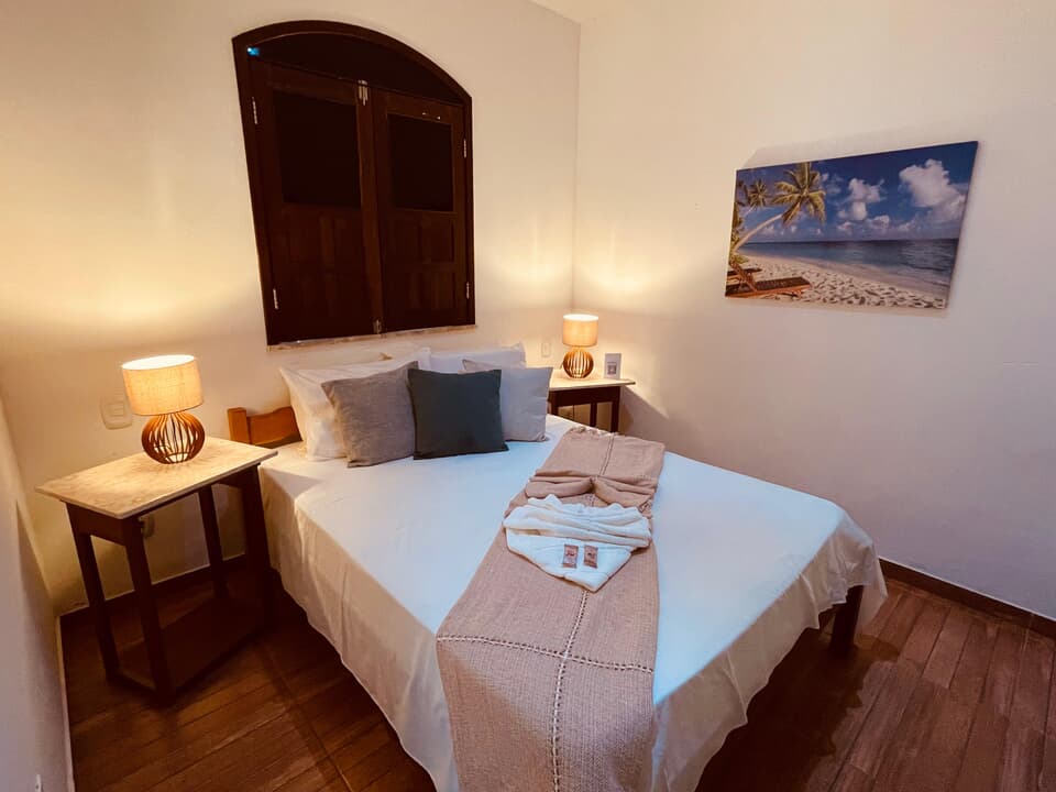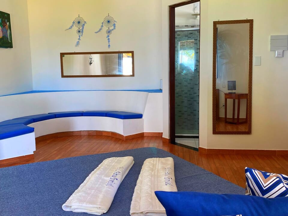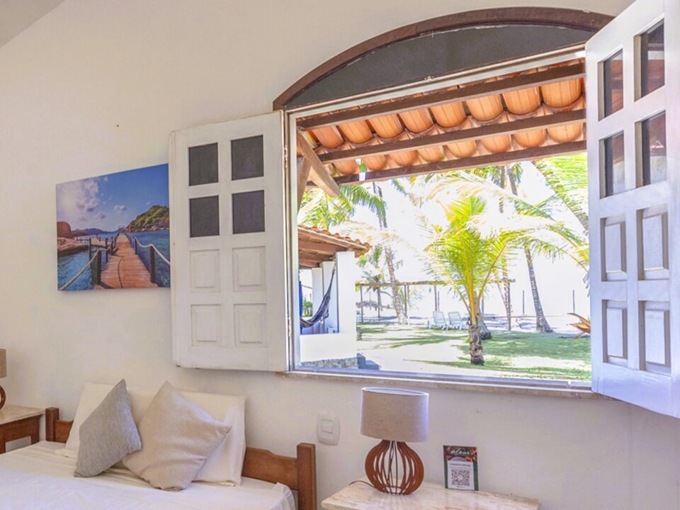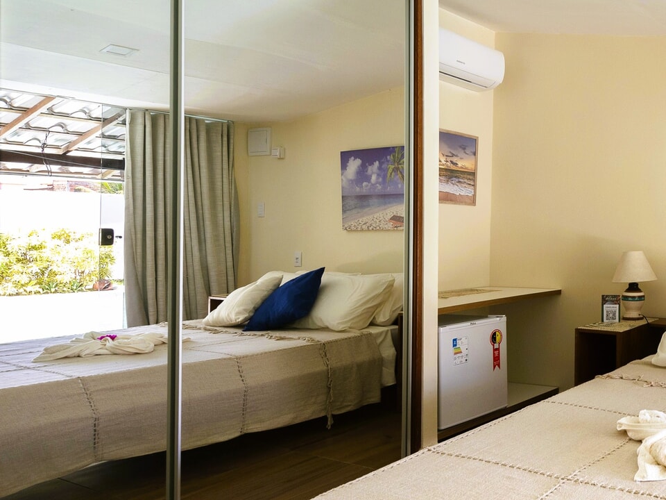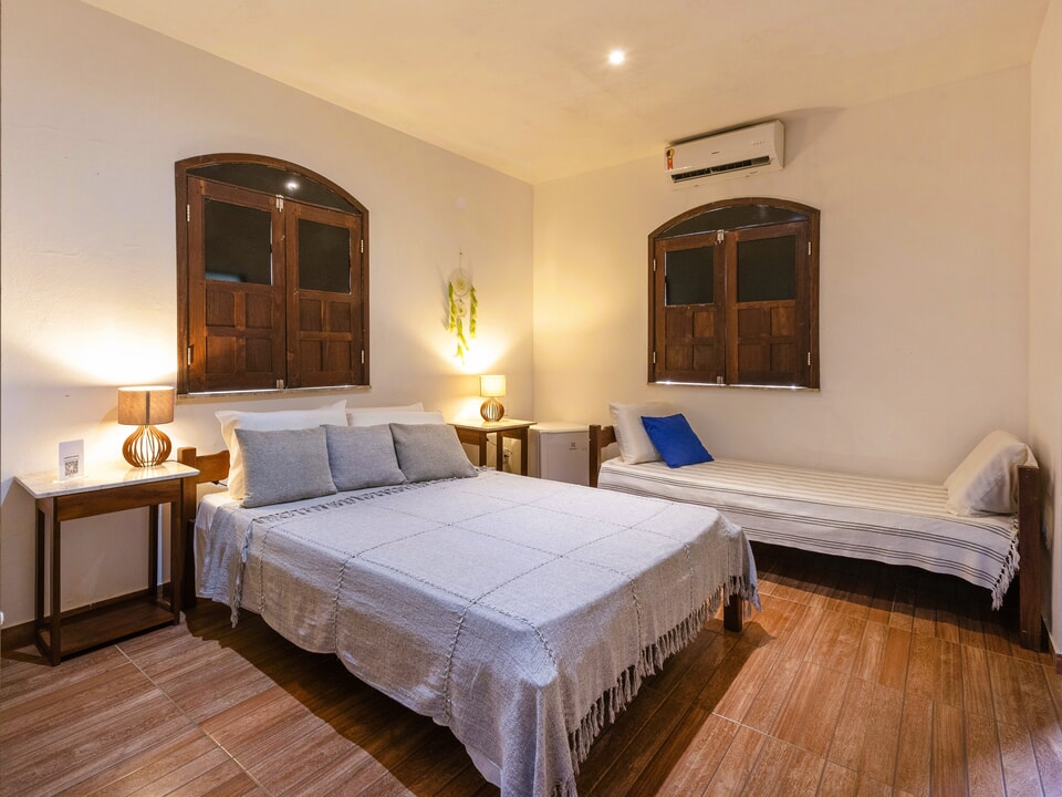 A Suíte Quadrupla frente mar é uma Suíte pensada para atender uma família e mais em particular um CASAL com DOIS FILHOS (sempre tem um berço para acomodar mais um bebê). Ela é um apartamento com dois quartos: um quarto com cama de casal (guarda roupa, TV 32 polegada, ar condicionado e frigobar) mais um segundo quarto com duas camas de solteiro com ventilador de teto - além do banheiro com box ducha) A Suíte possui uma varanda frente mar com rede e duas cadeiras e mesa em madeira para curtir a vista e a brisa do mar que fica a poucos metros de distancia. A voltagem 220V e sob pedido fornecemos secador de cabelo.