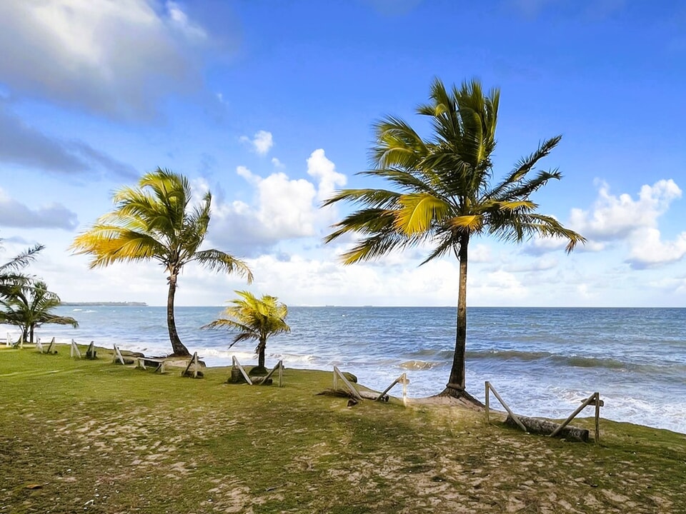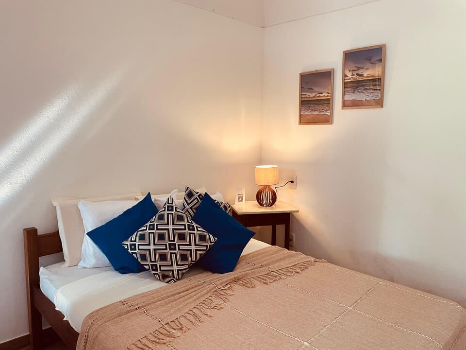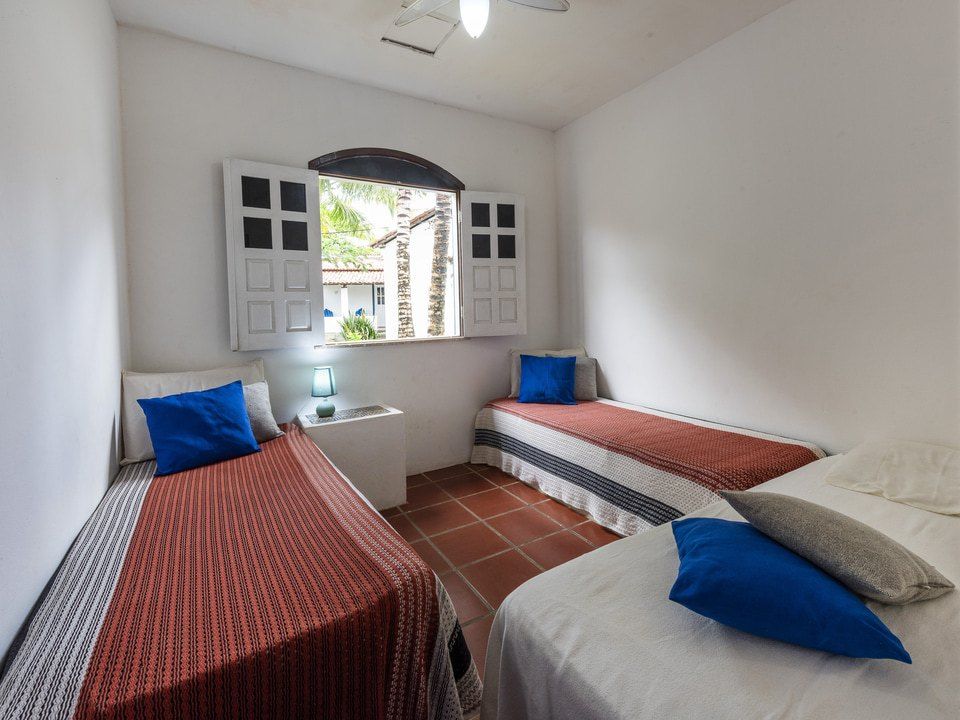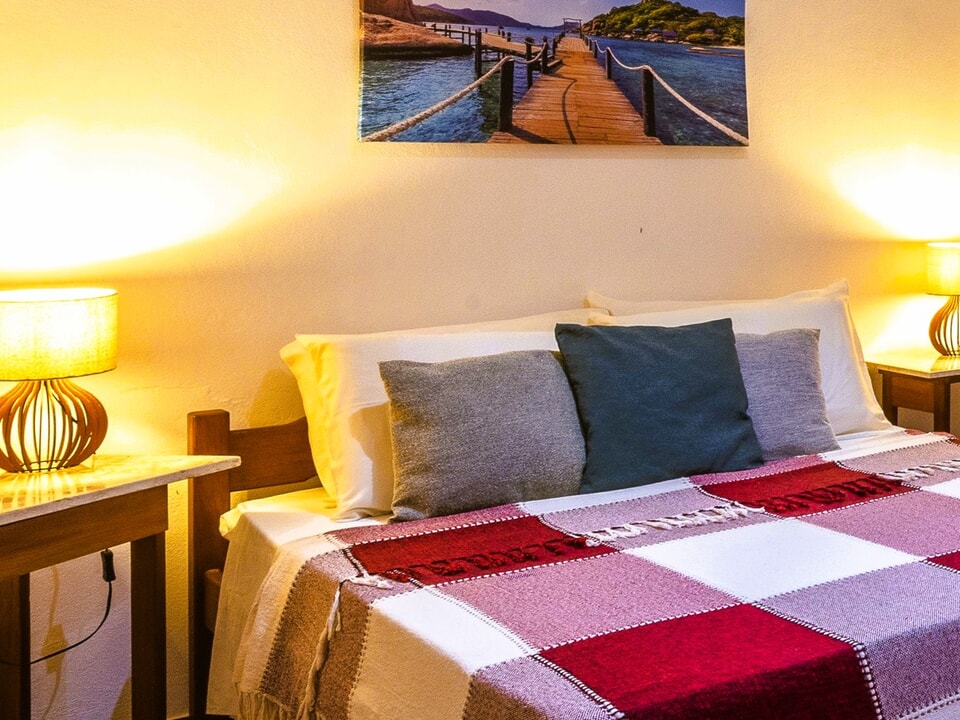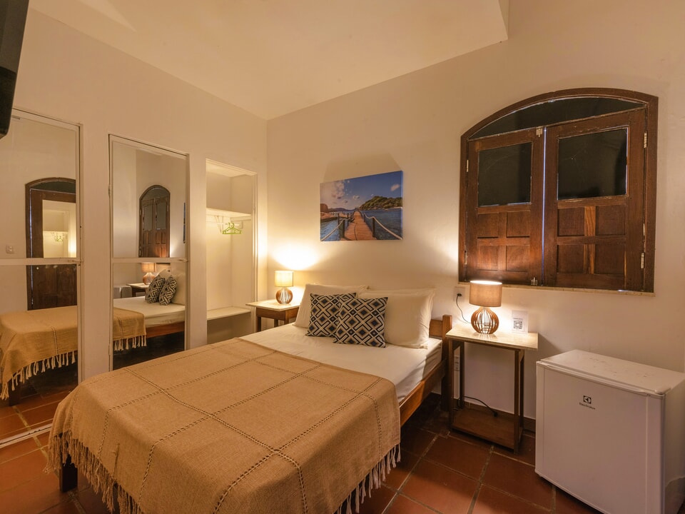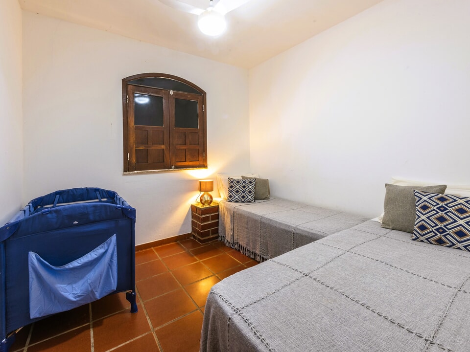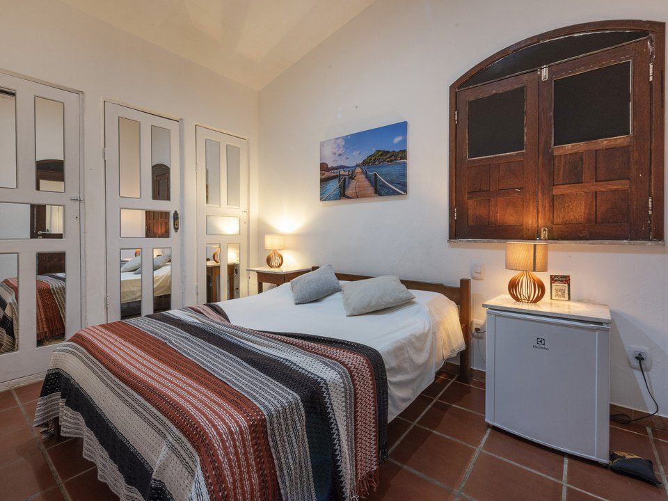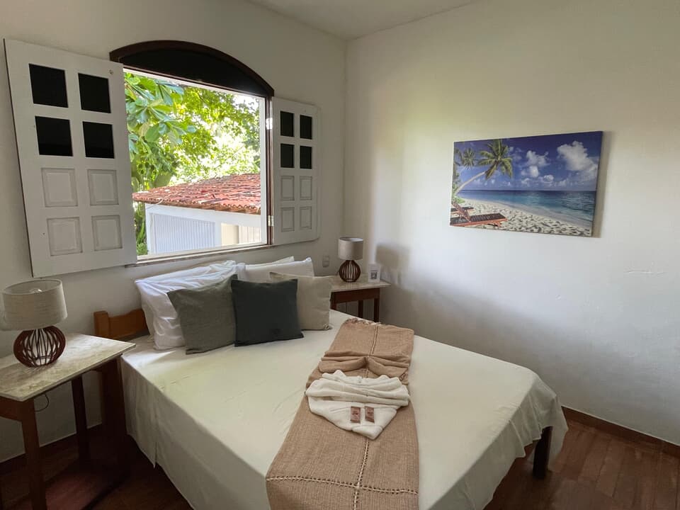 A Suíte Quadrupla frente mar é uma Suíte pensada para atender uma família e mais em particular um CASAL com DOIS FILHOS (sempre tem um berço para acomodar mais um bebê). Ela é um apartamento com dois quartos: um quarto com cama de casal (guarda roupa, TV 32 polegada, ar condicionado e frigobar) mais um segundo quarto com duas camas de solteiro com ventilador de teto - além do banheiro com box ducha) A Suíte possui uma varanda frente mar com rede e duas cadeiras e mesa em madeira para curtir a vista e a brisa do mar que fica a poucos metros de distancia. A voltagem 220V e sob pedido fornecemos secador de cabelo.