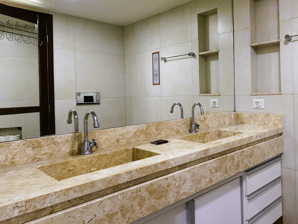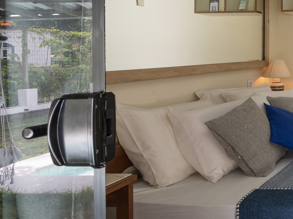 A Suíte é pensada para atender um CASAL com FILHO-A. Ela é um Suíte com dois quartos íntimos um com cama de casal (guarda roupa, TV 32 polegada, ar condicionado e frigobar) e outro com uma cama de solteiro - além do banheiro com box ducha. A Suíte possui uma varanda PRIVATIVA frente lagoa com rede e duas cadeiras e mesa em madeira para curtir a vista da lagoa, do jardim e da piscina que fica do outro lado da lagoa. A voltagem 220V e sob pedido fornecemos secador de cabelo.